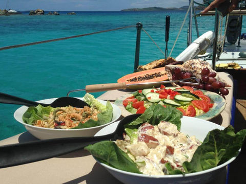 Upon arrival in St. John we will pass by the busy port of Cruz Bay and then enter the lush greenery and aqua waters of the Virgin Islands National Park passing by the Annaberg Sugar Plantation. The water in this are is some of the clearest in the world, it quite literally is paradise. We will visit two fantastic snorkeling locations while Island hopping along outer Keys of the US Virgin Islands. On your snorkel adventure you may spot sealife like sea turtles, stingrays, large tarpon, eagle rays, plenty of colorful fish and if we are lucky we will see dolphins or an octopus or two! During whale season (December – February), we may even spot the humpback whales as they swim between the USVI and BVI. After your swim, snorkel and fresh water rinse, we invite you to indulge in a freshly prepared lunch and refresh with a variety of beverages, including wine and local beer.